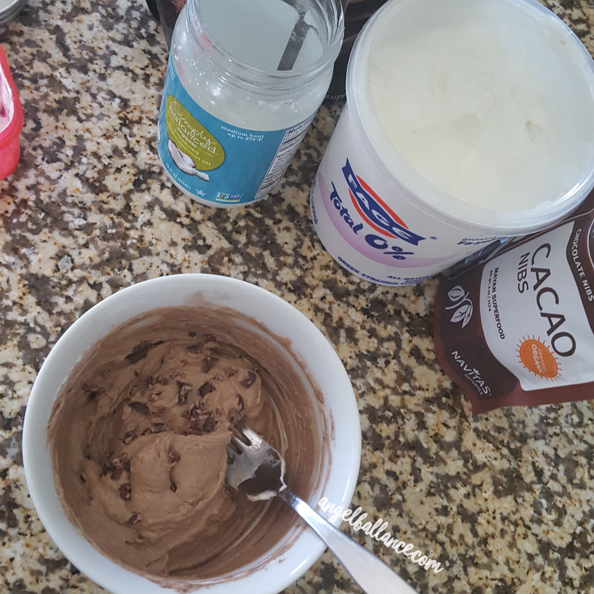 I opened up the fridge and noticed greek yogurt still untouched since our grocery run trip… PERFECT. But … usually I put that on a salad with taco meat (not cooking)! So… opened up the pantry and saw coconut oil & cacao nibs… YES!! idea born.