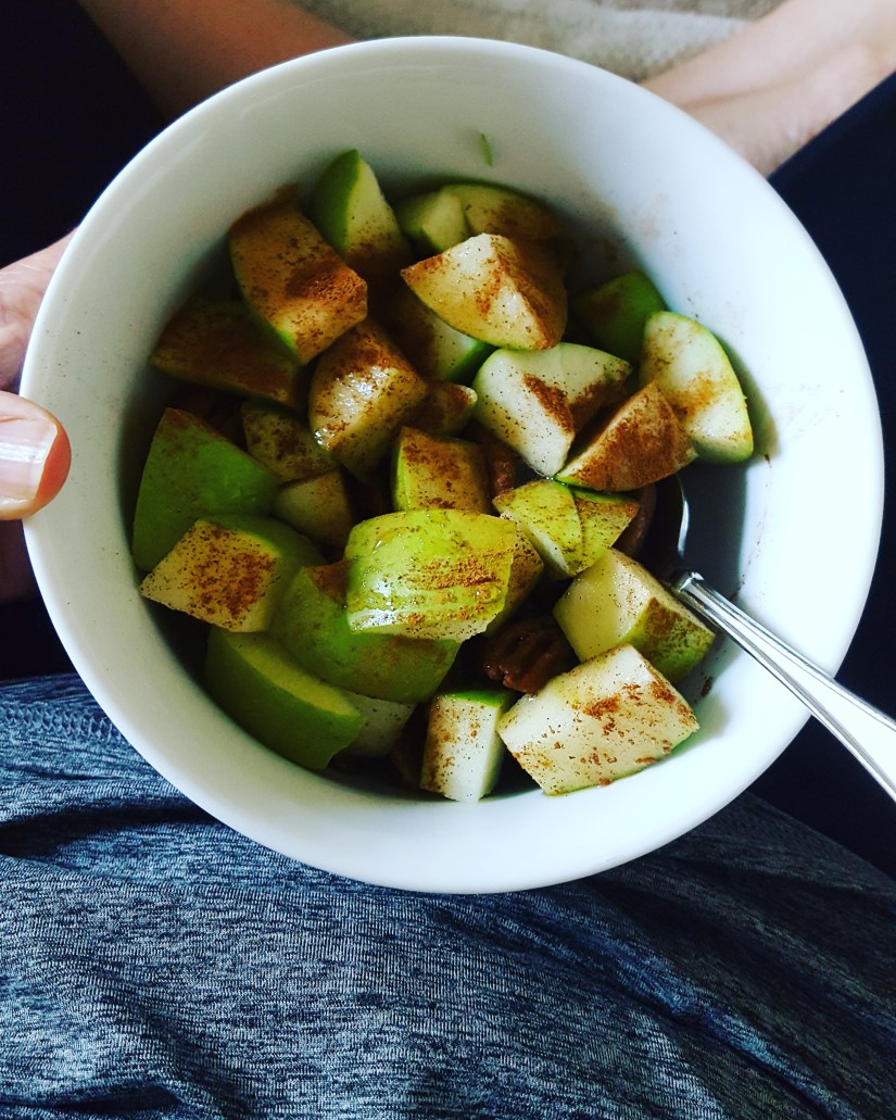 Simply chop up that tart green apple and pecans, sprinkle with cinnamon, and stir all together in a bowl.
