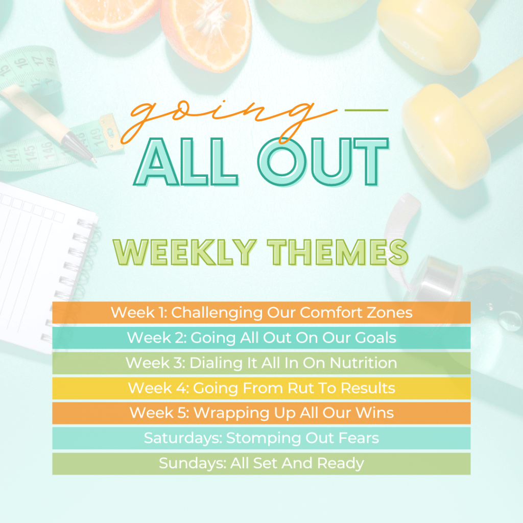 Then in week two we’re Going All Out On All Our Goals! We’ll talk how to set and work toward goals for every area of your health and wellness.