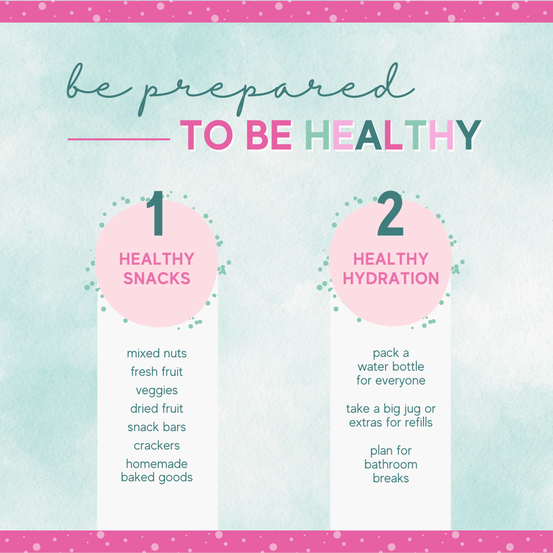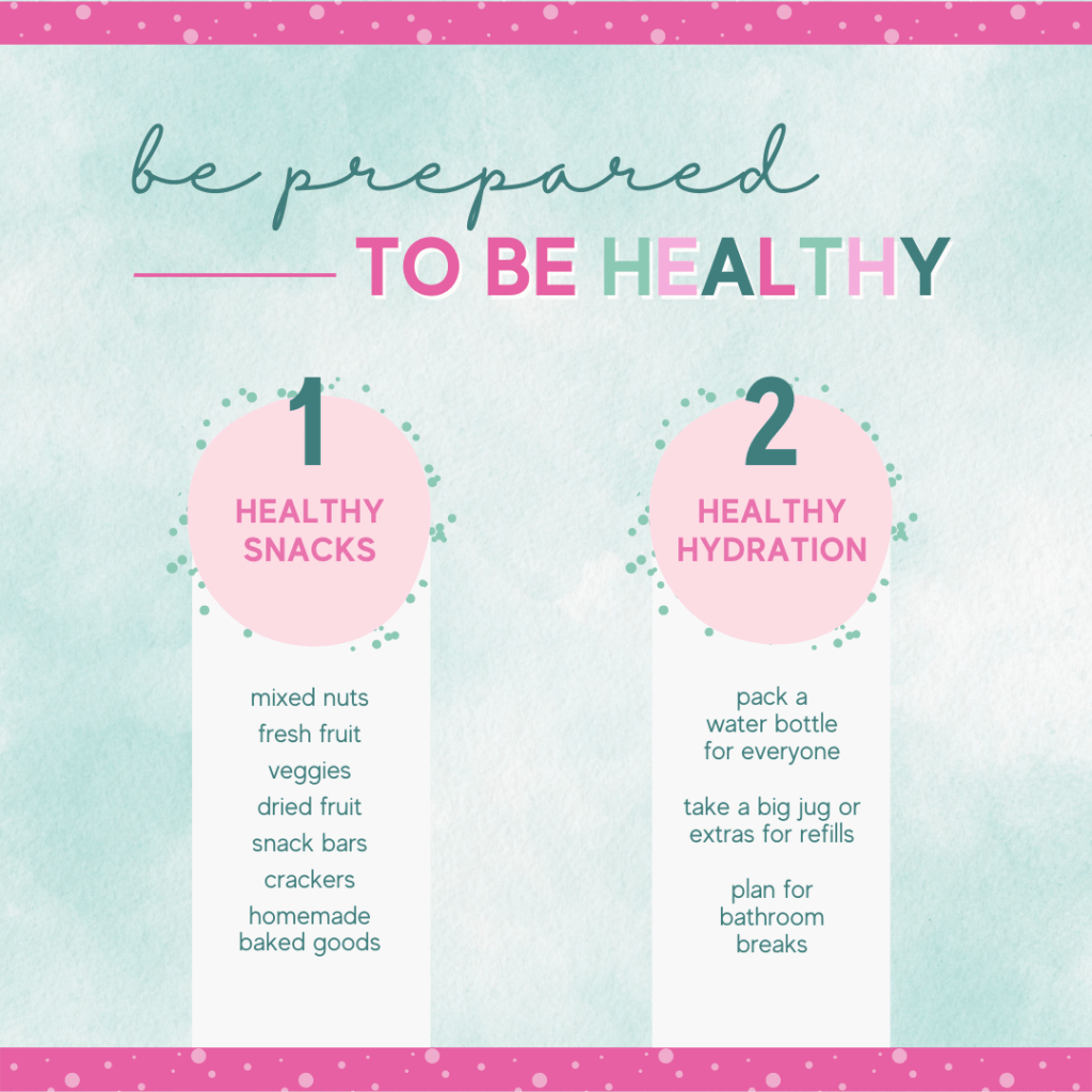 Pack snacks like mixed nuts (no peanuts if on a plane), fresh fruit and veggies, dried fruit, snack bars, crackers and homemade bars or muffins, fruit and veggie pouches or popcorn are all great to bring with. You can pack them in handy little containers (lots of ideas on Pinterest!) for the actual car or plane ride. Make sure you have enough set aside for when you are actually at your destination, so you and your family have something healthy to grab when you are hungry. 👌