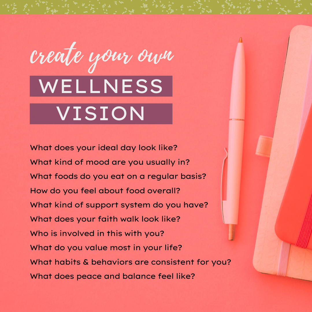 To get to that wellness vision, you will need to take time and focus on what that looks like in your own life. Here is a list of questions to ask yourself in order to start creating that picture of total wellness.👇