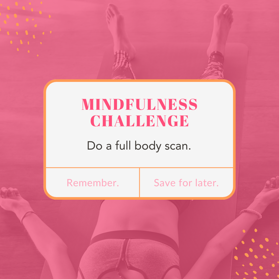 Now let’s try it! Today I challenge you to practice mindfulness by doing a body scan. This is a great way to get started because it doesn’t require anything but your body and you can start with a couple minutes and work your way up.
