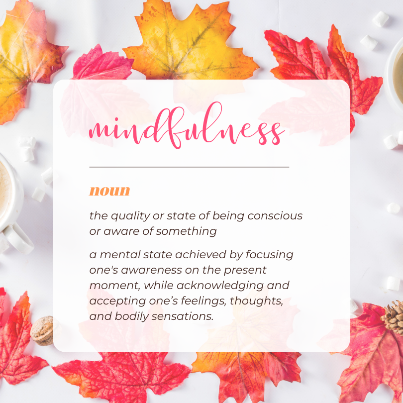 Mindfulness is “the quality or state of being conscious or aware of something” and “a mental state achieved by focusing one’s awareness on the present moment, while acknowledging and accepting one’s feelings, thoughts, and bodily sensations.”