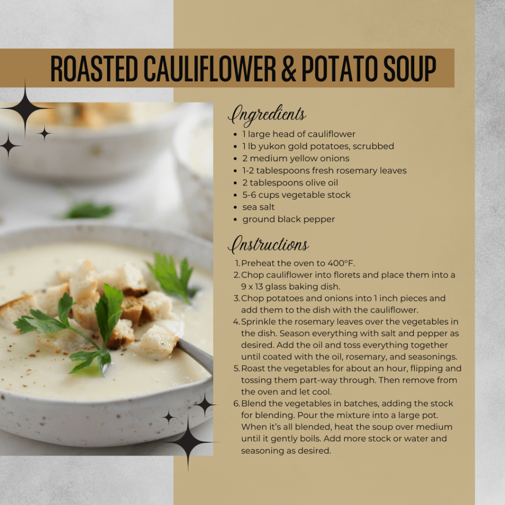 Let’s start with a Roasted Cauliflower & Potato Soup! Cauliflower always pairs well with potatoes, especially for those who aren’t huge fans of cauliflower. 😆
