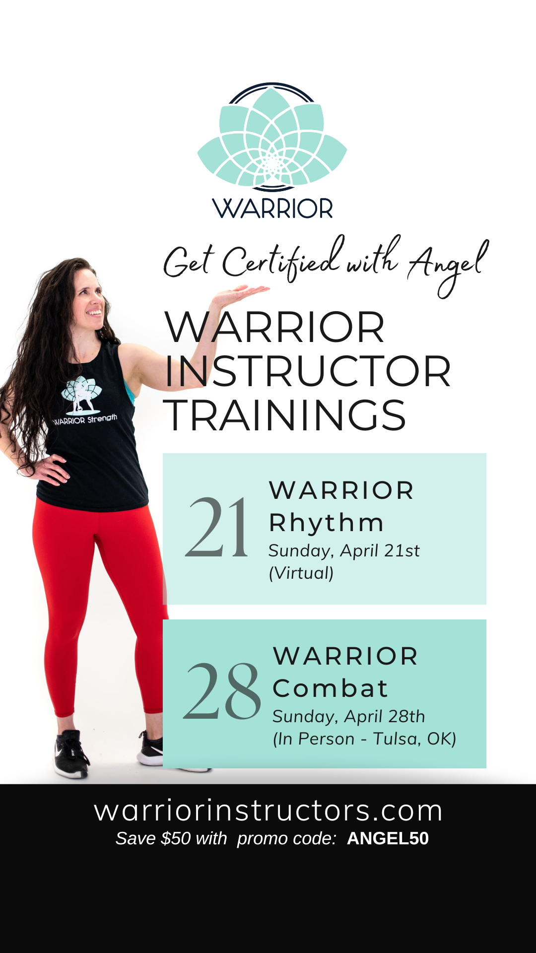 I have several WARRIOR Certifications coming up around the corner in April 2024. One WARRIOR Rhythm virtual on April 21st, and one WARRIOR Combat in person on April 28th in Tulsa, OK (surprise, it’s just a few hours outside of Dallas, TX, y’all)! Check them both out here and get certified to become a WARRIOR Instructor with me this Spring!